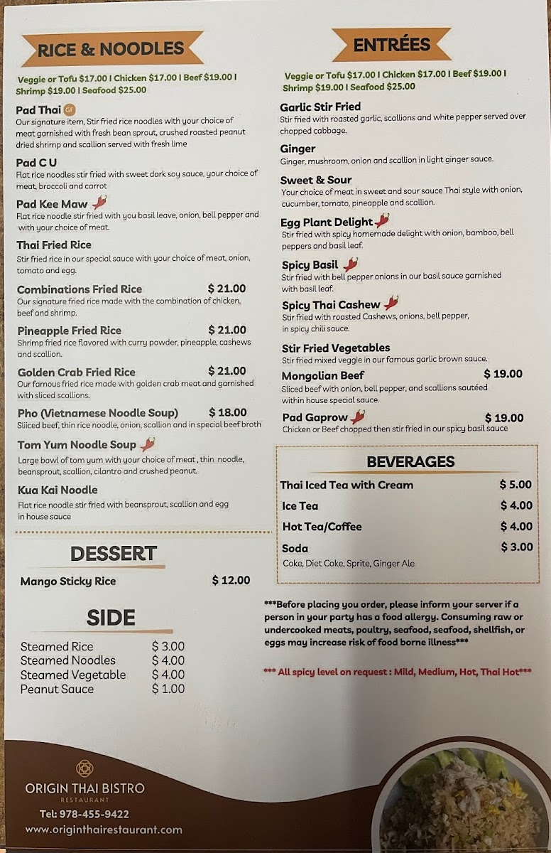 Welcome to Origin Thai Bistro, a hidden culinary gem nestled in Tewksbury, MA. The menu proudly showcases a vibrant selection of traditional Thai offerings that cater to diverse palates. Indulge in the classic Pad Thai and Thai Fried Rice, expertly seasoned and made with your choice of flavorful meats. For those seeking a delightful start, the Soft Spring Rolls paired with creamy peanut sauce and crispy Crab Rangoon promise to ignite your taste buds.